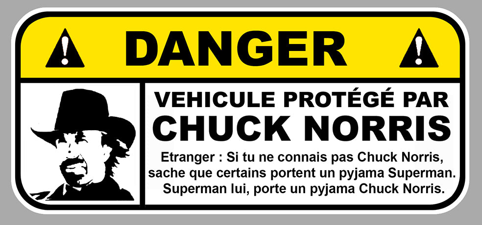 STICKER ATTENTION DANGER VEHICULE PROTEGE PAR CHUCK NORRIS VDM AUTO DROLE AUTOCOLLANT DA206