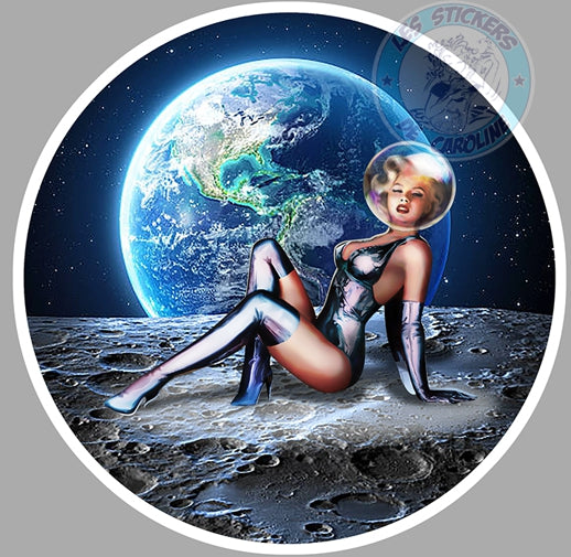 STICKER PINUP LUNE TERRE ESPACE AUTOCOLLANT PIN UP ASTRONAUTE DROIT LB048